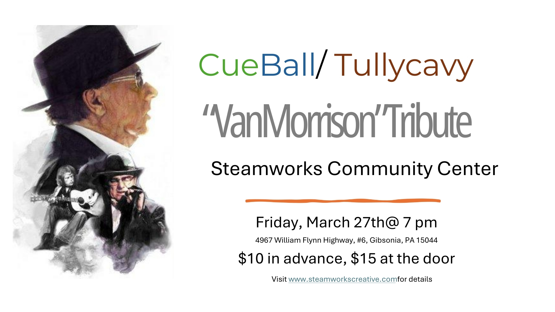 Steamworks Creative 4967 William Flinn Hwy #6, Gibsonia, PennsylvaniaCue Ball and Tullycavy – Van Morrison Tribute